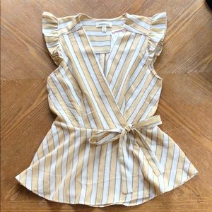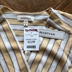 @argommm so sorry! I’ve been in the process of moving and had lost the shirt lol but I found it! It is a faux wrap and the waist is elastic across the front. It looks a little smaller than a true small. The waist measures 13” across. Pit to pit is 16” but there is loose fabric on the chest area. Length is 23”