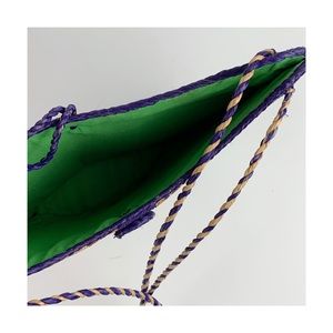 This super cute vintage wicker bag with double straps is perfect for any outfit. Cute purple button front closure and fabric lined. No inside zipper pocket. Shows signs of wear and age but adds to overall vintage look. Such a lovely piece.