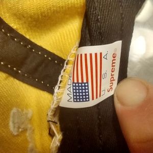Gebuine supreme flat brim hat. Made of 82% cotton yellow acrylic fabric. The 4, 5, 6 (a automatic win in cee-lo is rolling a ’4' '5' '6' for those who don't know) is embroided on the front panel the 5-panel hat. Black custom Patch on side of hat says "mouths can't get pregnant" in white text. And aint it the truth? Id call that a win. Plastic adjustable snap back in yellow. Underside of rim is green. Worn but in excellent condition. Get it before someone else does