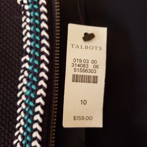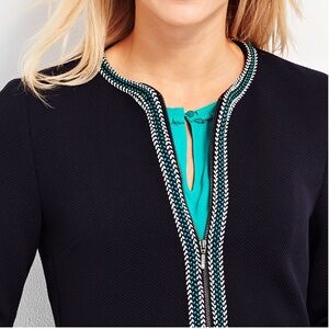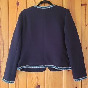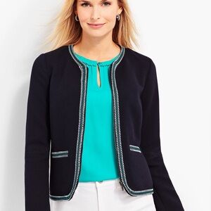 Talbots knit zipper front jacket / coat. Navy blue with white and teal / aqua trim. Also has navy lining on inside. Two outer pockets.