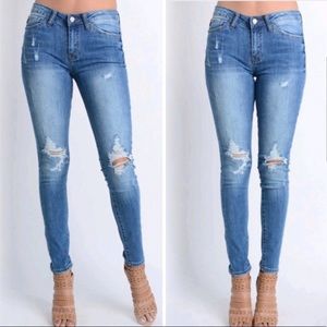 Defy redundancy with these distressed skinny denim jeans featuring heavy knee distress and some bleach fade. Made with a single button fastening, zip fly, minimal belt loop, two front pockets, and two back pockets.