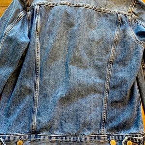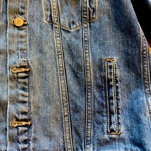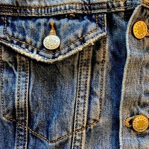 Women’s Lucky Brand tomboy denim trucker jacket in color “costa rh,” an acid wash denim. Size medium. Long sleeves, distressed hem. Like new, only worn once. No holes or stains, no fade.