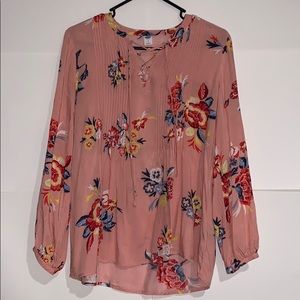A long sleeve silky blouse with flower designs. Has a tie-up v-neck with accordion styled material besides it. Material is very soft and smooth. Sleeves have a button wrist hold. Fits small- medium.