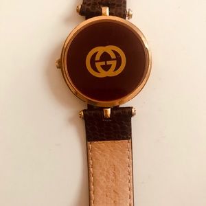 Add to your Collection this preowned GUCCI watch with Classic Red and Green undertone*Rare* two piece strap. Quartz movement- Swiss Made. It is in working condition, just replaced battery. Please note scratches to case and crystal.* Original watchband-excellent condition.