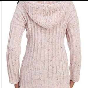 So much to love about this sweater...heavy gauge cable knit construction with hi/lo hem. V neck, drawstring hood. Poly/acrylic blend is machine wash, soft, warm & cozy. This sweater is so versatile; wonderful winter staple; great under denim. Brand new: factory direct. 1st out of pkg. No store wear or try-ons.