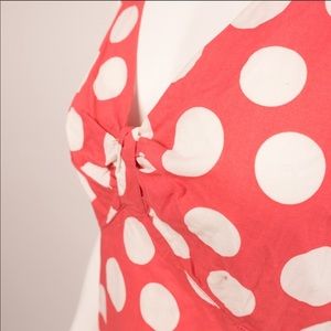This cute little coral and white, sleeveless, polka dot dress is in excellent preloved condition.