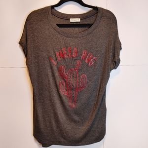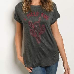NWT Boutique item. Size large. Multiple sizing options on this listing available. 94% Rayon 6% Spandex. Short sleeves, scoop neck, graphic print tee, buttery soft. Dark almost heathered gray with maroon lettering. Approximately 23 inches pit to pit and 29 inches in length.