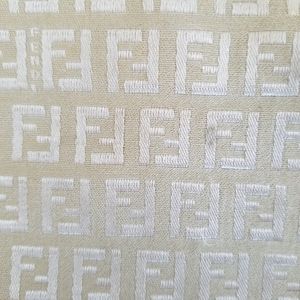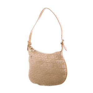 Creme and tan Zucca FF logo canvas Fendi Oyster bag with gold-tone hardware, leather trim, shoulder strap, tonal logo jacquard lining, inside pocket, & zip closure.