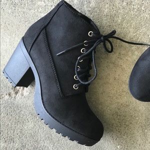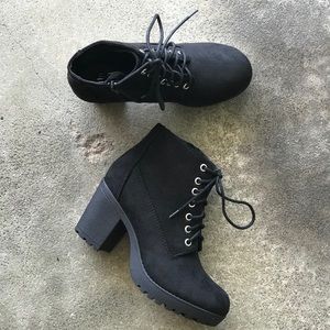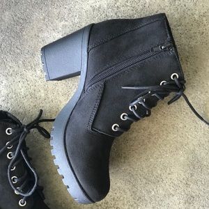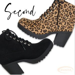 These Soda black military lace-up lug heel boots are the must-have boots for everybody’s closet. All are made of vegan faux suede materials & they are embellished with tie up black laces.. The chunky lug heel has a heel height of 3” .75” platform and these booties run true to size.