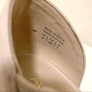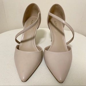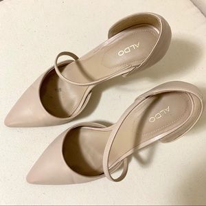 ALDO classic nude pointed toe pump with a 3.5 inch high heel, in a women’s size 9. These dress shoes have a single sole and cushioned footbed, plus a sexy sling strap going from the ankle and across the foot to the instep. Unsure if leather or vegan/faux leather. Includes original box!