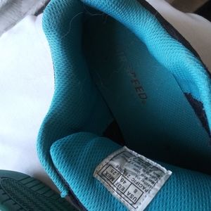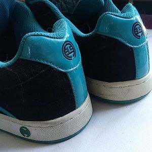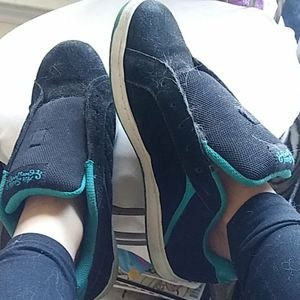 Black suede and cool blue embroidery. Chunky cute shoes. No laces. A little smaller that average 8 to me.