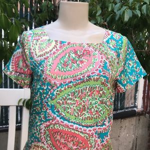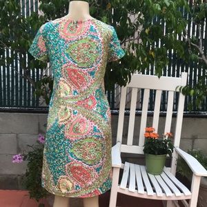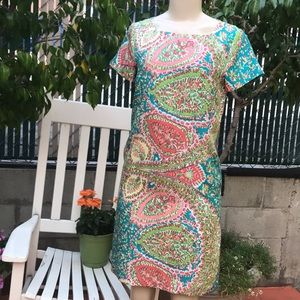 Talbots pastel paisley print straight line dress with lining size 2 worn once like new smoke free home , dry clean measurenments approx: when laying flat 35” length 17.5” hip to hip shell 100% silk lining 100% polyester