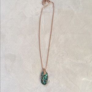 14K rose gold plated brass and one of the following: dusted glass, abalone shell, howlite, turquoise, or dyed mother-of-pearl