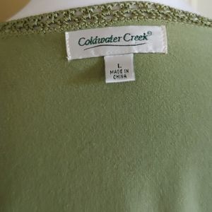 Coldwater Creek Wrap Shirt. The color is a pretty green and it's got pretty trim around the edges. The sleeves are 3/4 length and it's a Silk Cotton blend. It's a Size Large and EUC.