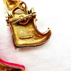 Two darling vintage Christmas Stocking Pins. Both are gold tone with red, green, & white enamel and rhinestones. One with Cat signed ART. One with movable Dog signed Gerrys. Cat one has faux pearls and holly leaves. Cat measures 2 1/2" high by 1 1/4" wide. Good condition with some light wear. Enamel loss on star on front of stocking. Dog measures 1 3/4" high by 1 1/8" wide. Good condition with light wear and some enamel loss. Gold tone on dog has some wear too. Nice vintage pins for the holidays