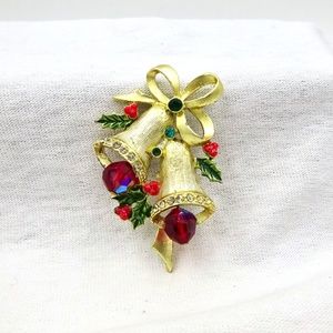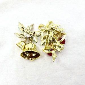 Two "Ringing Bells of Christmas" Pins Brooches. Two vintage holiday bells pins. Gold tone green & red enamel and rhinestones. The one with the gold bells rings. The red bead bells just move and dangle. Both are vintage neither one is signed for maker. Both are in very good condition. Ringing bells measures 2" high by 1 3/4" wide. Bead bells measures 2 1/4" high by 1 1/2" wide.