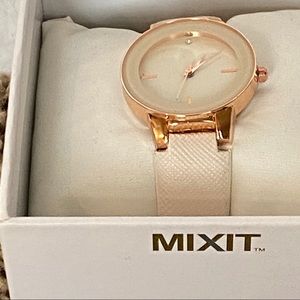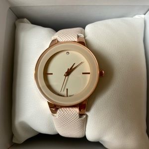 This watch has a soft peach band with a rose trimmed face. The hand and hour markers are also in rose gold and the 12 o’clock is marked with a rhinestone