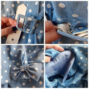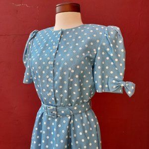 Chic and trending capsule wardrobe polka dot print button circle skirt princess midi dress that takes you from office career to weekend, to vacation travel, concert, party, and date night, don't miss this vintage gem from the 80's! Ladies size Vintage 8/ modern fit 4/ Small; pastel chambray baby blue and white pattern; soft stretchy Polyester/ Cotton; button torso; bows on sleeves; unlined; waist belt; brand Jenny. Excellent condition. TY! Jen
