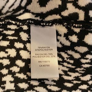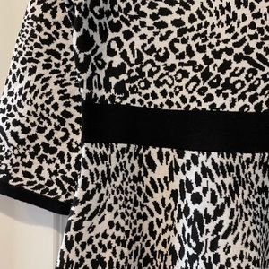 Go wild in this stylish knit dress featuring an allover leopard print and contrast trim. Scoop neck. 3/4 length sleeves. Solid banded waist. Leopard print. Knit construction. Approx. 40”