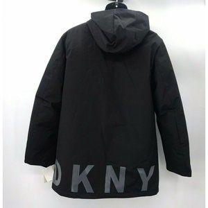 DKNY outfits your cold-weather adventures with this classic thigh-length hooded parka, featuring ribbed storm cuffs, a variety of pockets and the iconic logo at the sleeve.