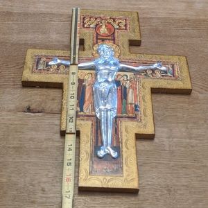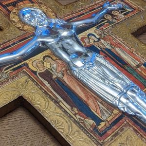 From jeweler shop in Italy. Marked 925. Large, impressive. The dimensional relief figure of Jesus is on wood with a paper print of saints.