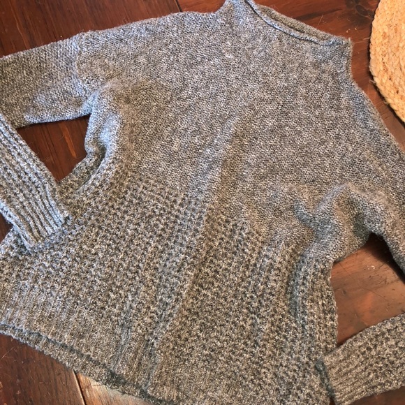 the bottom portion of this sweater is waffle knit as seen in pics. warm sweater perfect for fall and winter. mock neck. size small, true to size. only worn once or twice, really nice heathered olive green color