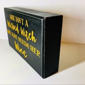 BRAND NEW WOOD BOX SIGN BY THREE GIRLS & A WISH. IT IS A BLACK WOOD SIGN WITH THE PHRASE SHE ISN’T A WICKED WITCH SHE JUST NEEDS HER WINE IN GOLD GLITTER LETTERS. IT MEASURES 8 INCHES WIDE AND 5 INCHES TALL.