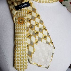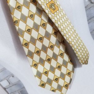 GIANNI VERSACE mens 100% silk tie medusa heads yelow gray pebbles diamonds square print necktie 3.75" x 58". Made in Italy.
