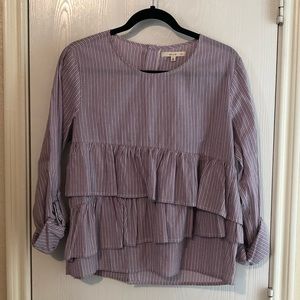 Long sleeve (rolled up cuff) blouse. Blouse has buttons down the back and cute ruffles on the front.