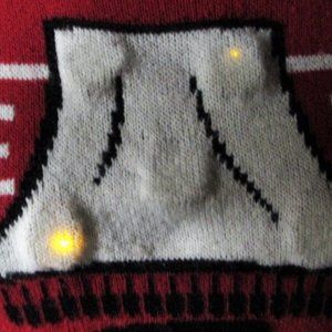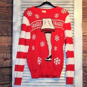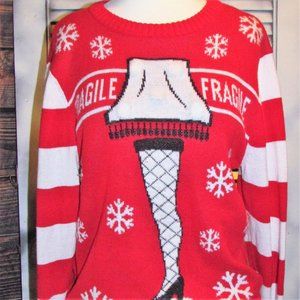 The ultimate Christmas sweater! Light up major award leg lamp from A Christmas Story. Size small. 55% cotton, 35% polyester, 10% acrylic. Machine washable. Made in China.