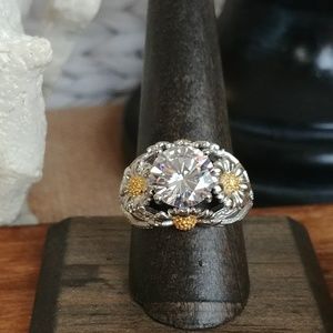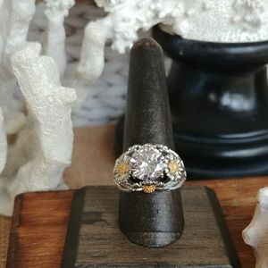 Gorgeous top jewelers grade CZ stone, approximately 5 1/2 ct size, set in sturdy white and yellow rhodium finished over alloy ring. Wear casual or dress it up.