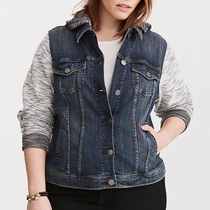 This dark wash denim jacket has attached black and white French terry sleeves and a hoodie for a cozy, casual look.