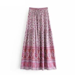pink white Boho gypsy Floral Print Maxi Skirt