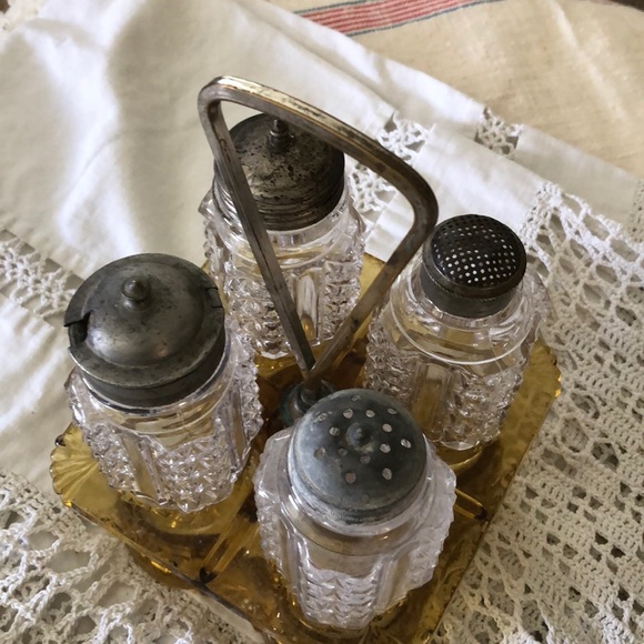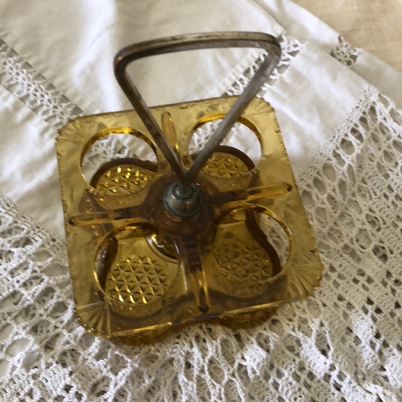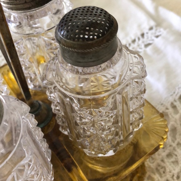 GUC: Old, charming & lovely is this 1890’s era antique service piece made by US Glass. Base itself in remarkable condition considering its age, a bit of corrosion on the handle, pictured, & *each* pressed glass bottle is chipped along the *inside* of (each) bottle, pictured, completely covered w/lids on, lids have patina. The original bottles were amber, someone replaced them with clear ones. Probably best to use as a decor piece rather than as a functional service piece. Still a lovely old antique w/a tremendous amount of charm. Haven’t seen many cool pieces like this in a long time!