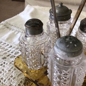 used for oil n vinager., I don't believe the base is original because of the glass colors, but still a great early piece😁
