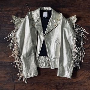 Adidas’s Jeremy Scott’s JS Wings Jacket and Vest is seems inspired by angels. This extravagant biker jacket features in all with fringes, wing and an appealing bright metallic gold color. The JS Gold Wings Jacket was part of Adidas Originals Jeremy Scott Feb 2012 launch. This extremely rare example is in new condition, size is M.