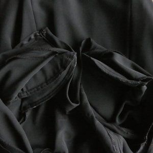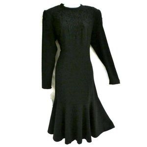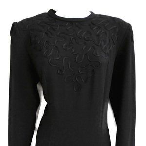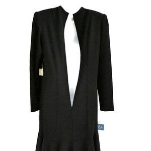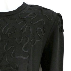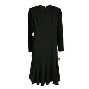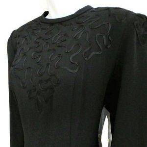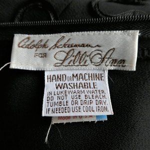 NEW NOS Adolph Schuman For Lilli Ann Dress Vintage 60s Union Tag. Black. Embellished Puffy Sleeves with Shoulder Pads. Long Sleeves. Flattering Princess Seams. Ric Rac Ribbon Embellished. Center Back Zipper. Satin Lined Peplum. Machine Wash. Made in USA. Tagged Size 10.