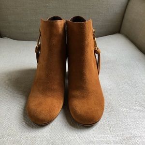 See by Chloe Louise Ankle Boots. Beautifully crafted in Brown Suede, and accented w Gold toned O Ring and Logo Charm. Side zipper and 2 3/4 heel completes the look. The Logo-engraved hardware adds a playful charm to these boots. Would look fabulous with a cute dress or jeans.
