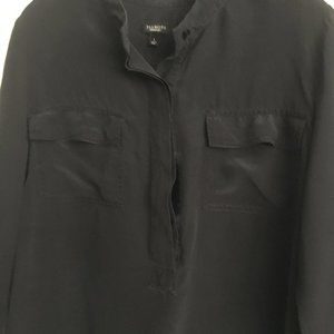 Buttons at cuffs, banded collar, hidden buttons that go down about 1/3 of way except for the top button