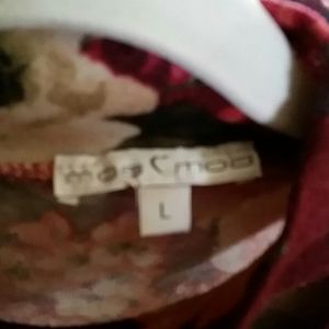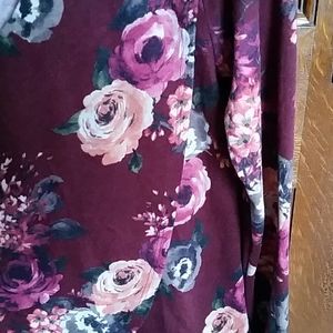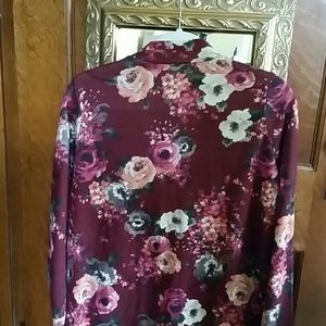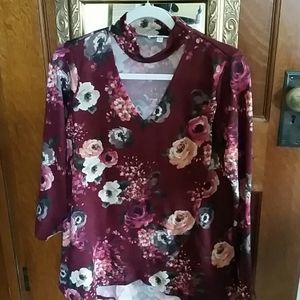 Maroon Flowered Soft long sleeved knit top with wrap detail on the rt. Side. Back slightly longer. Choker Style V-neck Sz.L Brand Moa Moa Has a bohemian feel! Vintage inspired! Pair with your favorite jeans or velvet leggings!