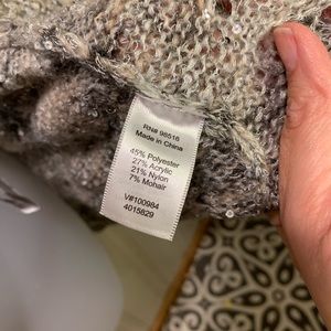 Beautiful, sparkling open front cardigan in a marled grey, cream, and tan colorway. A generous dose of sequins are sewn throughout the sweater. The open weave provides plenty of stretch. **smoke-free, pet-loving home**