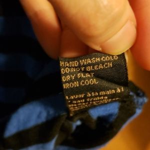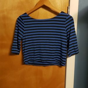 This crop top is super cute! It has stripes on black and classic blue (it's Pantone's color of the year!) It's in near-perfect condition but has some funky stitching on one shoulder (see photo.) No holes, just looks like they may have gone over it a couple of time with the sewing machine.
