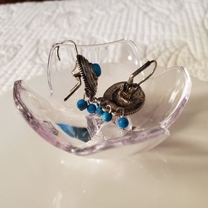 Vintage Silver tone metal lever back earrings with turquoise colored cabochon and beads. EUC