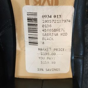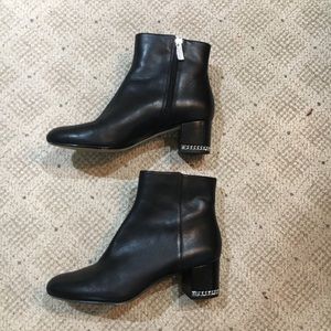 Michael Kors Black “Sabrina” Leather Ankle Boots w/ Block Heel. Has a Silver Linked Initial Chain Around the Bottom of Heels. Worn 1x. Excellent Condition w/ a few Barely Noticeable Marks from Storage. SEE PICS.