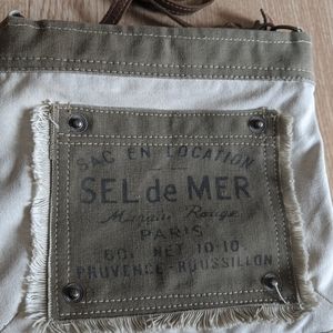 Myra purse made of upcycled canvas. French, Paris inspired with "sel de mer" printed across front. Boho frayed edge style gives it a unique flair. These bags are handmade in india.