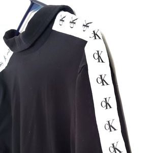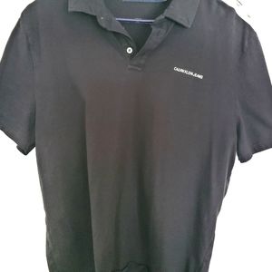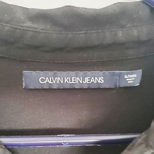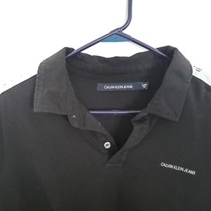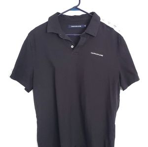 Calvin Klein Polo. Black in color with white stripes along sleeve with CK logo going down the white stripe. Size is XL extra large. Made in India. 100% cotton.