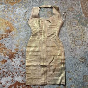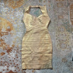 Near perfect condition, no visible flaws, brilliant gold Herve Leger bandage dress. Form fitting and shaping, high end, hand made piece. Fold storage, not meant to be hung for long periods of time.