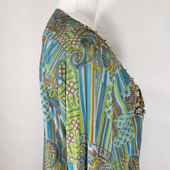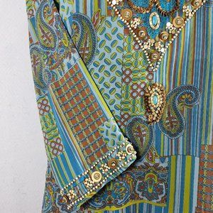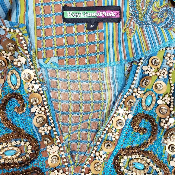 Gorgeous semi-sheer beaded Boho-style top tunic by Key Lime & Pink was purchased new at Dillard’s & worn twice. Excellent pre-owned condition, no damage or stains. Extensive beading area on front & cuffs is lined. Polyester, hand washable. Turquoise, rust, gold, light blue colors. Wear with cami (or not!) or as pool coverup. Approx measurements taken flat: