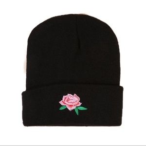 A super cute all black cuff beanie hat with a pink Rose embroidered on the front. Brand new and from both a pet free and smoke free home. Price is firm