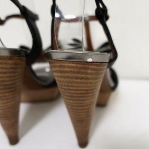 Lanvin Bow T-Strap Sandals Silver & Black Leather Size 37 Wood Platform Heel